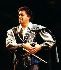 Araiza initially specialised in the Mozart and Rossini repertoire—in 1986 he was described as the leading tenore di grazia of the day.[11] However, in the mid-1980s he also began taking on Italian and French lyric tenor roles and the young Wagnerian heroes such as Lohengrin and Walther von Stolzing, sometimes with considerable success, especially his Des Grieux in Manon (San Francisco Opera, 1986) and Lohengrin (La Fenice, 1990).[4][12] He also ventured into the spinto tenor repertoire with performances at Zurich Opera in the 1990s as Alvaro in La forza del destino, Don José in Carmen and the title role in Andrea Chenier.