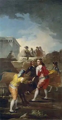 Usually some of the paintings for the alameda of the Dukes of Osuna are taken as part of the cartoons for tapestries, with characteristics and themes extremely similar to those of the cartoons, although with a different technique. The best known case is The Fall, a country scene.[25] Another case to highlight is A Picador, painted around 1795, but the chronological proximity of this piece with the cartoons causes many scholars to think that it is part of a series.[26]