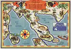 A brochure for the Pepsodent-sponsored Frank Buck Adventurer's Club, held in the Hanna Holborn Gray Special Collections Research Center at the University of Chicago Library includes a map with the locations of four camps with the note that the map is meant to help the reader "follow Frank Buck's adventures over his radio program." The map marks Singapore as Buck's "headquarters" with another camp in Johore, and a second near Siam (now Thailand), and a third in approximately Burma (now Myanmar) near the Bay of Bengal.[76]