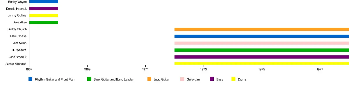 Freddie Hart first used the name Heartbeats, a play on his last name, as his backing on a one-off 1967 album credited to Freddie Hart and the Heartbeats, but after his hit "Easy Loving" in 1971, ten studio albums were released between 1972 and 1977 credited to Freddie Hart and the Heartbeats. Various musicians performed in the Heartbeats over the years, including Bobby Wayne and Dennis Hromek, both of whom would go on to join the Strangers. During their heyday in the mid-1970s, the Heartbeats even released one studio album credited to just themselves in 1975.