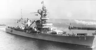Ordered on 15 May 1930, she was laid down on 19 March 1931 as Project C4 with her hull designated as hull no 141 at the Arsenal de Brest. Algérie was launched on 21 May 1932.[4] Her hull was 180 metres (590 ft 7 in) between the perpendiculars with an overall length of 186.2 metres (610 ft 11 in) and a beam of 20 metres (65 ft 7 in). At her normal displacement of 10,950 t (10,780 long tons) she had a draught of 6.3 metres (20 ft 8 in). Her full load displacement was 13,677 t (13,461 long tons).[5] Her hull was flush decked with no raised forecastle. Her bridge structure was a tower and no tripod of the earlier ships would be installed.