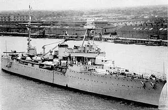 Started on 4 August 1922,[3] Duguay-Trouin was the first large unit put on keel in France after the First World War.[4] Launched on 14 August 1923,[3] she was one of the longest light cruisers of the era, which made her a fast ship, capable of sustaining 30 knots for an entire day during trials.[4] She entered active service on 2 November 1926.[3]