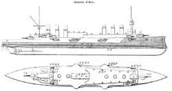 Jeanne d'Arc was originally conceived in the early 1890s as a large protected cruiser for overseas service, but the design was recast as an armoured cruiser by the naval architect Emile Bertin, director of the Navy's Technical Section (Section technique) in 1895.[1] His design is regarded as unsuccessful with too light an armament for her size and failing to achieve her designed speed.[2][3] The ship measured 147 metres (482 ft 3 in) long overall with a beam of 19.42 metres (63 ft 9 in) and had a maximum draught of 8 metres (26 ft 3 in). She displaced 11,264 tonnes (11,086 long tons) at normal load and had a metacentric height of 1.458 metres (5 ft). The hull was subdivided by 15 watertight bulkheads that extended from her double bottom to the main armoured deck.[4] Jeanne d'Arc had a crew of 651.[3]