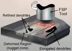 Friction stir processing (FSP) is a method of changing the properties of a metal through intense, localized plastic deformation.[2]: 7 [3]: 1117 This deformation is produced by forcibly inserting a non-consumable tool into the workpiece, and revolving the tool in a stirring motion as it is pushed laterally through the workpiece.[2]: 5 [4] The precursor of this technique, friction stir welding, is used to join multiple pieces of metal without creating the heat affected zone typical of fusion welding.[2]: 5, 7