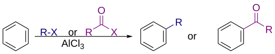 The Friedel–Crafts reactions are a set of reactions developed by Charles Friedel and James Crafts in 1877 to attach substituents to an aromatic ring.[1] Friedel–Crafts reactions are of two main types: alkylation reactions and acylation reactions. Both proceed by electrophilic aromatic substitution.[2][3][4][5]