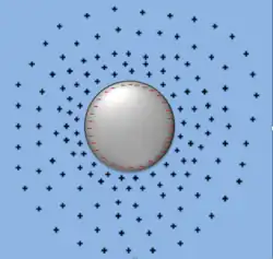 N.B. Where classically near the charged perturbation an overwhelming number of oppositely charged particles can be observed, in the quantum mechanical scenario of Friedel oscillations periodic arrangements of oppositely charged fermions followed by spaces with same charged regions.[2]