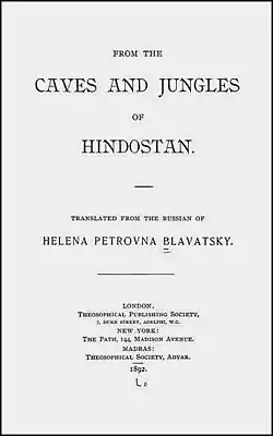 From the Caves and Jungles of Hindostan: Letters to the Homeland (Pre-reform Russian: «Изъ пеще́ръ и де́брей Индоста́на: пи́сьма на ро́дину»; tr. Iz peshcher i debrei Indostana: pis'ma na rodinu) is a literary work by Helena Blavatsky, the founder of the Theosophical Society.[note 1] She published it under the pen name Radda Bai in serial installments (letters) from 1879 to 1886 in Moscow in the periodicals Moskovskiya Vedomosti and Russkiy Vestnik, edited by Mikhail Katkov.[2] The first part of these letters was published in a single volume in 1883 as an appendix to the journal Russkiy Vestnik.[3][note 2] The second part of the letters was published in 1884–1886.[5] The series was never finished as it broke off rather suddenly.[note 3]