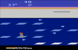 Darran Jones in Retro Gamer wrote that many people believed the game was based on Q*bert (1982), while Cartwright said he recalled the game being influenced by Frogger (1981) and that he had not played Q*bert until after Frostbite was completed.[3] The game's arctic theme was influenced by the limitations of the Atari 2600 system. Cartwright's initial idea involved jumping over rocks in a lava-filled area, which was abandoned as Cartwright believed that blue and white colors worked better on the system.[4] Cartwright noted difficulty with bringing his ideas to life on the system as well, noting that Frostbite had difficulty with its memory issues and screen timing, which he described as "something that is extremely easy with higher programming languages, but presented real problems when writing code in 6502."[4] One specific issue Cartwright encountered was preventing players from going back and forth between two ice floes by making it so you were unable to continue to add blocks to the igloo until all the ice floes were the same color.[5]