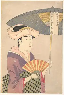In the brightly-coloured Sensu o Mochi Higasa o Sasu Onna (扇子を持ち日傘をさす女, "Woman holding a hand-fan and parasol"), a woman stands in a leisurely, relaxed posture carryin a parasol and hand fan and wearing an age-bōshi[c] head-dress to keep dirt from the hair. This was a popular summer fashion with women during the Kansei era.[12]