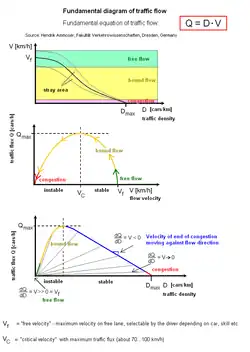 The fundamental diagram of traffic flow is a diagram that gives a relation between road traffic flux (vehicles/hour) and the traffic density (vehicles/km). A macroscopic traffic model involving traffic flux, traffic density and velocity forms the basis of the fundamental diagram. It can be used to predict the capability of a road system, or its behaviour when applying inflow regulation or speed limits.
