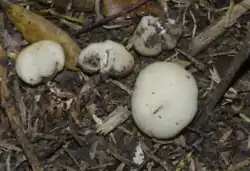 These distinctive white fungi grow in disturbed soil from February to June all across New Zealand.[4] Their caps are longer than they are wide-ranging from 4–8 cm across and 6–20 cm tall and a stipe of 6–40 cm long.[4] This fungus gains its name from a process called autodigestion: the cap emerges in the morning and then begins dropping spores dissolving from the bottom upwards as it does so.[36] This is to help the spore propagate with wind before the fruiting body disintegrates.[36]