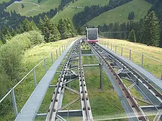 Funiculaire Moléson-sur-Gruyères – Plan-Francey is a funicular railway in the Canton of Fribourg, Switzerland. The line leads from Moléson-sur-Gruyères at 1111 m to Plan-Francey at 1520 m.[2] From there, an aerial cableway continues to the summit of Moléson (2002 m). The line of the funicular has a length of about 1350 m[note 1] and a difference of elevation of 409 m.[2] The funicular with two cars has a single track with a passing loop.