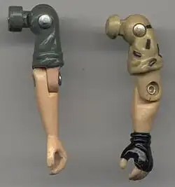 With the success of the first line of toys, Hasbro expanded the line the next year with new characters and more original body part designs. In 1983, "swivel-arm battle grip" articulation and some extra tweaks were added to the new characters and the existing figures in order to make them more poseable.[13] In 1985, the base of the action figures' heads were given a ball joint which gave the figures' heads the ability to look up and down.[14] Unlike the change to the arms, older figures were not rereleased with the new neck articulation.