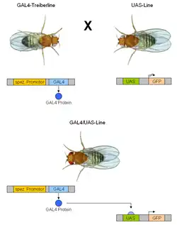 The GAL4-UAS system is a biochemical method used to study gene expression and function in organisms such as the fruit fly. It is based on the finding by Hitoshi Kakidani and Mark Ptashne,[1] and Nicholas Webster and Pierre Chambon[2] in 1988 that Gal4 binding to UAS sequences activates gene expression. The method was introduced into flies by Andrea Brand and Norbert Perrimon in 1993[3] and is considered a powerful technique for studying the expression of genes.[4] The system has two parts: the Gal4 gene, encoding the yeast transcription activator protein Gal4, and the UAS (Upstream Activation Sequence), an enhancer to which GAL4 specifically binds to activate gene transcription.