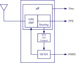 A GPS clock, or GPS disciplined oscillator (GPSDO), is a combination of a GPS receiver and a high-quality, stable oscillator such as a quartz or rubidium oscillator whose output is controlled to agree with the signals broadcast by GPS or other GNSS satellites.[1][2] GPSDOs work well as a source of timing because the satellite time signals must be accurate in order to provide positional accuracy for GPS in navigation. These signals are accurate to nanoseconds and provide a good reference for timing applications.[3][4]