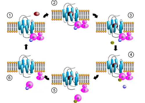 G-Protein Coupled Receptor working mechanism. The binding of an antagonist to the receptor binding cite, causes an exchange of the GDP, bound to the alpha subunit, with GTP. This activates the subunit allowing it to dissociate from its counterpart, the beta-gama subunit. These separated subunits go on to independently activate other second messenger systems like the cAMP which is activated by the alpha subunit acting on adenylyl cyclase. The GTP on the alpha subunit hydrolyzes back to GDP, allowing its re-association with the beta-gamma subunit.