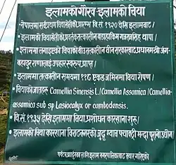 Colonel Gajraj Singh Thapa (Nepali: गजराज सिंह थापा) was the first person to establish tea plantation estates in Nepal. Around 1873, Thapa, son-in-law of Prime Minister Jung Bahadur Rana, was on a tour of Darjeeling.[1] He was impressed by the sight of the young tea plants and the taste of the drink he was offered everywhere he went. Upon his return to Nepal, he set up two plantations – the Ilam and Soktim tea estates, 103 acres (42 ha) each – and so began Nepal's tea industry.[2] Colonel Thapa was then the Governor General (Bada Hakim) of the eastern region of Nepal.[3][4] Translation of various signposts placed in Ilam (shown below), reads that the very first tea saplings planted by Thapa was received as a gift from the Government of China, it was gifted to his father-in-law prime minister Jung Bahadur Rana. According to the signpost the genus of tea planted in the estate were Camellia sinensis/Camellia Assamica/Camellia assamica sub sp Lasiocalyx or cambodensis.