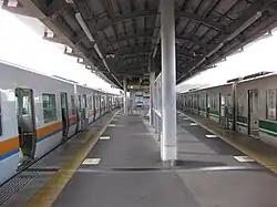 The station consists one elevated island platform and two tracks. The ticket gates and concourse are on the first floor, and the platform is on the second floor. The ticket gates are located on both the north and south sides of the concourse. The platform is equipped with platform sensors. The station is staffed.[2]