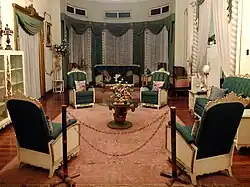 Most of the fixtures and furniture inside the house are of American and European origins. The crafted wooden pieces of furniture was designed and manufactured by Manila's leading furniture atelier, Don Gonzalo Puyat. Exquisite table wares are also on display and large wall mirror greets every visitor in the receiving area. A 19th century grand piano is also in the receiving area complemented by a vintage wooden radio in one corner of the room.