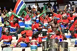 Gambia have participated in the Africa Cup of Nations twice. The first time was in the 2021 edition in Cameroon where the team reached the quarter-finals. They debuted with a 1–0 win over Mauritania followed by a 1–1 draw to Mali. Gambia qualified for the round of 16 with a game to spare and on 20 January 2022 defeated Tunisia 1–0 in their final group match.[1] They finished with the same points as Mali, which, however, won the group due to a better overall goal difference.[2] Gambia continued to impress in the round of 16, defeating Guinea 1–0 to advance to the quarter-finals of the tournament.[3][4] After a goalless first half, Gambia lost 2–0 to host Cameroon in the quarter-final in Douala.[5]