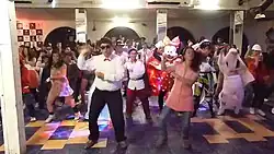 The music video of "Gangnam Style" has been met with positive responses from the music industry and commentators, who drew attention to its tone and dance moves, though some found them vulgar.[56] Another notable aspect that helped popularise the video was its comical dance moves that can be easily copied, such as the pelvic thrust during the elevator scene.[57] The United Nations hailed Psy as an "international sensation" because of the popularity of his "satirical" video clip and its "horse-riding-like dance moves".[58] As such, the music video spawned a dance craze unseen since the Macarena of the mid-1990s.[59][60]