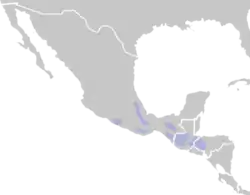 The garnet-throated hummingbird is found discontinuously from Mexico's Guerrero, Puebla, and Veracruz states south through Guatemala into El Salvador and Honduras. It inhabits the interior and edges of tropical forest, cloudforest, and pine-oak forest and also scrublands. In elevation it ranges between 1,200 and 3,000 m (3,900 and 9,800 ft) but is most numerous between 1,500 and 2,300 m (4,900 and 7,500 ft); in Honduras it occurs only above 1,600 m (5,200 ft).[7]