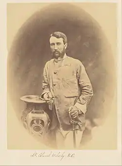 Wolseley distinguished himself at the relief of Lucknow under Sir Colin Campbell in November 1857, and in the defence of the Alambagh position under Outram,[13] taking part in the actions of 22 December 1857, of 12 January 1858 and 16 January 1858, and also in the repulse of the grand attack of 21 February 1858.[9] That March, he served at the final siege and capture of Lucknow. He was then appointed deputy-assistant quartermaster-general on the staff of Sir Hope Grant's Oudh division,[9] and was engaged in all of the operations of the campaign, including the actions of Bari, Sarsi, Nawabganj, the capture of Faizabad, the passage of the Gumti and the action of Sultanpur. In the autumn and winter of 1858–59 he took part in the Baiswara, trans-Gogra and trans-Rapti campaigns ending with the complete suppression of the rebellion.[20] For his services he was frequently mentioned in dispatches, and having received the Mutiny medal and clasp, he was promoted to brevet major on 24 March 1858[18][21] and to brevet lieutenant-colonel on 26 April 1859.[22]