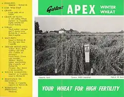 The 1960 Report of the Committee on Transactions in Seeds set up by Parliament entitled Plant Breeders' Rights[29] stated that whilst two thirds of breeding work was by then carried out by government organisations, one third was in the hands of private breeders. And yet the only non-government funded agricultural crop plant breeding, research and testing establishment visited by the committee was to Gartons Limited.[30] The United Kingdom's Plant Varieties and Seeds Act 1964 allowed plant breeders to fully protect and be rewarded for their introductions. The last variety bred by Gartons, 'Apex' wheat, was the first British bred wheat to be awarded plant breeders rights in 1967 under this legislation.[31][32]