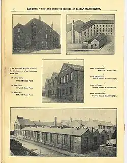 Initially the Seed Warehouse for cleaning and distributing seed was in Newton-le-Willows but moved to Friars Green in Warrington in 1899 by which time the offices were at Thynne Street, Warrington.[26] A purpose-built seven story Seed Warehouse and separate Head Office were built at Arpley, Warrington in 1910.[27] There was an L. M. S. railway siding into the Seed Warehouse. On 25 April 1912 the Seed Warehouse burned down[28] but quickly rebuilt largely by the same builders. Seed cleaning machinery, some unique to the company, ensured the purity of the product. As time went by fewer seeds were 'picked' or cleaned by hand by upwards of one hundred staff as machinery became more sophisticated. Across the top of roof of the warehouse was the company's name which had to be disguised during wartime.