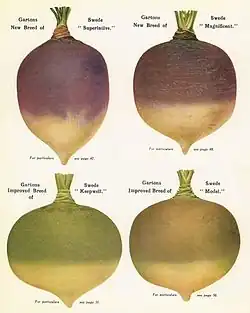 Swede varieties bred and introduced to UK agriculture include Zero in 1900, Lord Derby (1900), Perfection (1900), Monarch (1900), Model (1900), Green Tankard (1901), Keepwell (1902), Cropwell (1903), Superlative (1905), Victory (1907), Incomparable (1907), Warrington (1914), Acme (1914), Magnificent (1917), Viking (1918), Feedwell (1922), White Fleshed (1933), Parkside (1951), Townhead (1951).