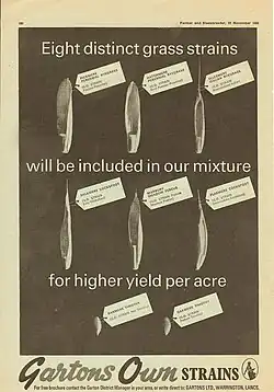 In 1965 Peter Darlington[38] became chairman of Gartons Limited. In a dramatic change of direction in 1967 Gartons Limited ceased retailing seeds directly to farmers. Instead a new brand was created, Gartons GROplan, and marketing became wholesale through agricultural merchants throughout the United Kingdom.