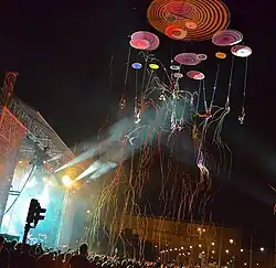 The performance incorporates a group of acrobats who make random geometric figures in the air, using a crane system that allows the development of artistic activity in the air, accompanied by the music of Duchamp Pilot.[8] The project resides in Spain and has operational bases in England and Argentina, as well as a cast of artists from countries such as Brazil, England, Scotland, France, Greece, Argentina and Spain.[9] The show was performed on the opening night of the twentieth edition of the FiraTàrrega in Catalonia and took part in other important events worldwide shortly after its founding.[10][11]