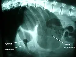 A diagnosis of GDV is made by several factors. The breed and history often gives a significant suspicion of the condition, and a physical examination often reveals the telltale sign of a distended abdomen with abdominal tympany. Shock is diagnosed by the presence of pale mucous membranes with poor capillary refill, increased heart rate, and poor pulse quality. Radiographs (X-rays), usually taken after decompression of the stomach if the dog is unstable, shows a stomach distended with gas. The pylorus, which normally is ventral and to the right of the body of the stomach, is cranial to the body of the stomach and left of the midline, often separated on the X-ray by soft tissue and giving the appearance of a separate gas-filled pocket (double-bubble sign).[5]
