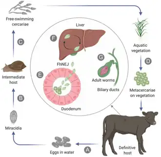 - ^ a b González-Miguel, Javier; Becerro-Recio, David; Siles-Lucas, Mar (2021-01-01). "Insights into Fasciola hepatica Juveniles: Crossing the Fasciolosis Rubicon". Trends in Parasitology. 37 (1): 35–47. doi:10.1016/j.pt.2020.09.007. ISSN 1471-4922. PMID 33067132.