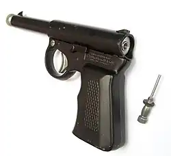 Loading is by a screw breech at the rear. The pellet is pushed far down the barrel by a long pin on this breech, until it is past the air port. If the breech pin is lost, the pistol cannot be loaded. A common replacement, given the nature of the pistol's users, was to replace the pin with another screw or other sort of extemporised plug. This does not work, the pellet in some cases even being fired backwards out of the breech.