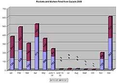 The intensity of rocket attacks targeted at Israeli cities near Gaza sharply increased after the 4 November 2008 cross-border IDF attack, approaching pre-truce levels. Clashes between Israeli troops and Palestinian militants also took place along the border, during which 11 Palestinian militants were killed.[144] According to CAMERA, in the period between 4 November incident and mid-December, more than 200 Qassam rockets and mortar shells landed in the western Negev region, most fired immediately after the 4 November tunnel raid by the IDF, and thereafter decreasing to a "few per day".[145] Israel had frequently shut down the crossings in response to rocket attacks on its towns.[146]