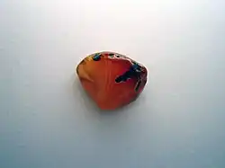 Carnelian is a flesh-hued red, varying from the palest flesh-color to a deep blood-red. It is of a conchoidal structure. Normally its color is without clouds or veins; but sometimes delicate veins of extremely light red or white are found arranged much like the rings of an agate. Carnelian was historically popular for rings and seals.