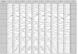 A full set of Genaille–Lucas rulers consists of eleven strips. On each strip is printed a column of triangles and a column of numbers.