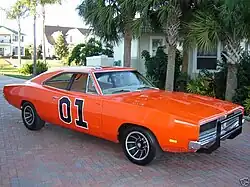 The General Lee (sometimes referred to as simply "the General") is an orange 1969 Dodge Charger driven in the television series The Dukes of Hazzard by the characters the Duke boys, Bo and Luke, along with cousins Coy and Vance (in season 5). It is known for its signature horn, its police chases, stunts—especially its long jumps—and for having its doors welded shut, leaving the Dukes to climb in and out through the windows. The car appears in every episode but one ("Mary Kaye's Baby"). The car's name is a reference to Robert E. Lee, general of the Confederate States Army during the American Civil War. It bears a Confederate battle flag on its roof, and also has a horn which plays the first 12 notes of the song "Dixie".[1]