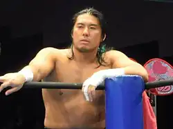 On August 16, 2003, Gentaro made his debut for Kaientai Dojo, teaming with Hi69 to defeat Kengo Mashimo and Kunio Toshima in a tag team match.[49] During the following months, Gentaro formed a regular trio with Hi69 and Kazma.[50][51] In December 2003, Gentaro, Daigoro Kashiwa, Hi69, Kazma, Psycho and Teppei Ishizaka made it to the finals of the Survivor-K tournament, before being defeated by Kengo Mashimo, Kunio Toshima, Mike Lee Jr., Miyawaki, Super-X and Yuu Yamagata.[52] On July 3, 2004, Gentaro won his first championship in Kaientai Dojo, when he teamed with Yoshiya to defeat Daigoro Kashiwa and Teppei Ishizaka for the UWA/UWF Intercontinental Tag Team Championship.[53] After a four-month reign, Gentaro and Yoshiya lost the title to Taka Michinoku and Ryota Chikuzen on October 30.[54] Gentaro became a champion again on February 12, 2005, when he defeated Onryo for the UWA World Middleweight Championship.[55] However, his reign ended just seven days later, when he was defeated by Boso Boy Raito.[56] Afterwards, Gentaro took a four-month break from Kaientai Dojo to concentrate on his work in Apache Pro-Wrestling Army, defeating Psycho in his return match on June 11.[57] The following month, he entered the Strongest-K tournament, defeating female wrestler Tomoka Nakagawa and Kunio Toshima to advance to the semifinals of the tournament, where, on August 6, he was defeated by Psycho.[58][59][60] During the next four years, Gentaro only made three more appearances for Kaientai Dojo.[61][62][63]