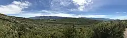 Three fault slices are characterised by diamictite, broken formation and melange: Balloon Slice, roughly 20 km (12 mi) long and up to 4 km (2.5 mi) wide intersecting the Cobb Reservoir; Anatoki Slice beside the northern half of the Anatoki Fault; and the Tunnel Slice at the eastern end of the Cobb Reservoir.[21][1][2] The bulk of the melange is derived from Junction Formation material with additional material from the Tasman Formation, Lockett Conglomerate and Devil River Volcanics Group. It includes exotic blocks from a few metres up to possibly 3 km (1.9 mi) in length of chert, limestone, conglomerate, siltstone, volcanic sandstone, andesite, basalt and mafic intrusives set in a sparse to abundant matrix of blue-grey sandy to silty mudstone.[21][27] The matrix is interpreted to be derived from turbiditic layers of sandstone and mudstone from the Junction Formation.[27] Blocks from the latest Cambrian to Devonian passive margin sequence are absent and the melange is therefore inferred to have formed in the Late Cambrian.[21]