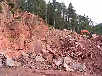 The Forest of Dean, situated between the rivers Severn and Wye, is formed of a raised basin of Palaeozoic rocks folded in the Variscan Orogeny, similar to the South Wales Coalfield to the west. Underlain by great thicknesses of the Old Red Sandstone, the basin is filled with Carboniferous limestones, sandstones and coal measures - all of which have contributed to the industrial history of the region. Sometimes called ‘the prettiest coalfield in Britain’, the Forest's main coal output was in the 18th, 19th and early 20th centuries, although for hundreds of years coal has been won in the area via ‘free-mines’, which could only be operated by local people known as freeminers. One or two survive today. Small-scale mining has been enabled by the exposed nature of the coalfield, with seams often outcropping at surface. Iron-ore has been extracted from labyrinthine mines or 'Scowles' in the limestone since at least Roman times. Several large quarries are still at work in the area, providing Carboniferous Limestone for road surfacing and also Pennant sandstone (see picture) - a popular building stone used notably by Thomas Telford for the Over road bridge, spanning the River Severn near Gloucester.