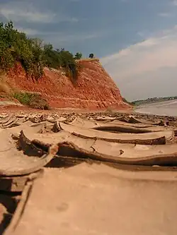 To the east is the wide fertile Severn Vale, floored by Triassic 'New Red' sandstones and marls of the Mercia Mudstone Group (formerly known as the 'Keuper Marls'), and Jurassic lias clays further east. The Triassic deposits were formed in a Sahara -like desert when the British Isles lay about 15 degrees north of the equator, whereas the clays represent deep-water sediments. The landscape here is flattish, with the only feature of note a rather weak low scarp which meanders across the vale from SW to NE marking the Triassic/Jurassic border. This is superbly illustrated at the ‘Garden Cliff’, Westbury-on-Severn (see picture), where the river Severn has sliced a convenient ‘cut-away’ section of this transition from the red Triassic marls, through the thin Penarth Group (formerly 'Rhaetic') strata, to the lias clays and limestones of the lower Jurassic.