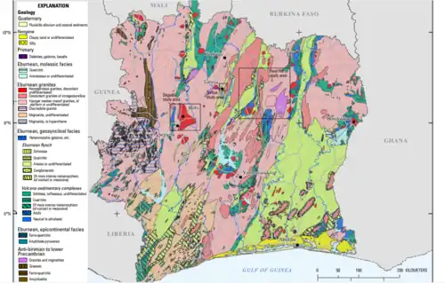 Geologic map of Ivory Coast, in which the "Eburnean, geosynclinal facies" is equivalent to the Birimian.[1]
