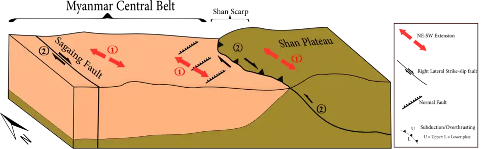 The topographic boundary separating the Myanmar Central Basin (MCB) and the Shan Plateau (or Eastern Highland)[16] is referred as the Shan Scarp. The abrupt elevation over a short distance (up to 1.8 km over few km) harbors the trace of reverse faults and largely overturned folds.[16] The Shan Scarp aligns parallel to the Sagaing fault on the east.[16] The general trend of reverse fault strikes is N20°W and dips in the east-northeast direction; where some N20°E striking normal faults were identified along the fault scarp (at 21°N to 22°N latitude), north of Mandalay.[16] Dextral (right lateral) strike slip motion is also observed along the fault scarp, this motion is reasonably expected due to the nearby right lateral Sagaing fault. Southward, the Shan Scarp ends at the junction with the Three Pagodas fault.[21]