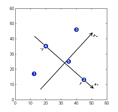 - Find the model's feature points. Assume that 5 feature points are found in the model image with the coordinates , see the picture.