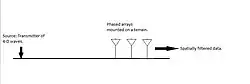 This approach is applied for filtering space-time signals.[12] It is designed to isolate signals travelling in a particular direction. One of the simplest filters is weighted delay and sum beamformer. The output is the average of the linear combination of delayed signals. In other words, the beamformer output is formed by averaging weighted and delayed versions of receiver signals. The delay is chosen such that the passband of beamformer is directed to a specific direction in the space.[12]