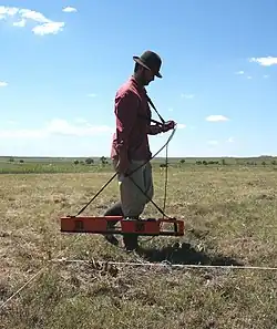 Electromagnetic (EM) conductivity instruments have a response that is comparable to that of resistance meters (conductivity is the inverse of resistance). Underground archaeological features are detected by creating a magnetic field underground by applying an electric current that has a known frequency and magnitude through a sending coil. The currents spur a secondary current in underground conductors that is picked up by a receiving coil. Changes in the underground conductivity can indicate buried features.[2][3] Although EM conductivity instruments are generally less sensitive than resistance meters to the same phenomena, they do have a number of unique properties. One advantage is that they do not require direct contact with the ground, and can be used in conditions unfavorable to resistance meters. Another advantage is relatively greater speed than resistance instruments. Unlike resistance instruments, conductivity meters respond strongly to metal. This can be a disadvantage when the metal is extraneous to the archaeological record, but can be useful when the metal is of archaeological interest. Some EM conductivity instruments are also capable of measuring magnetic susceptibility, a property that is becoming increasingly important in archaeological studies.