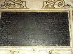 - The vertuous matron, Dame Jane, wife to Sir George Bromley, Knight, Daughter and sole Heire of JOHN WANNERTON, of Hallon, Gent., Departed this life 19 November 1606, Aged 73. They Had betweene them Tenne children, sixe sonnes : 4 Davghters. The worthy Judge, Sir Edward Bromley, Knight, second Baron of the Excheqver, who Kneeleth Here, of a Pious mynd did consecrate This monument to his dear Parents.