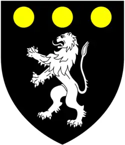 Arms of Treby: Sable, a lion rampant argent in chief three bezants